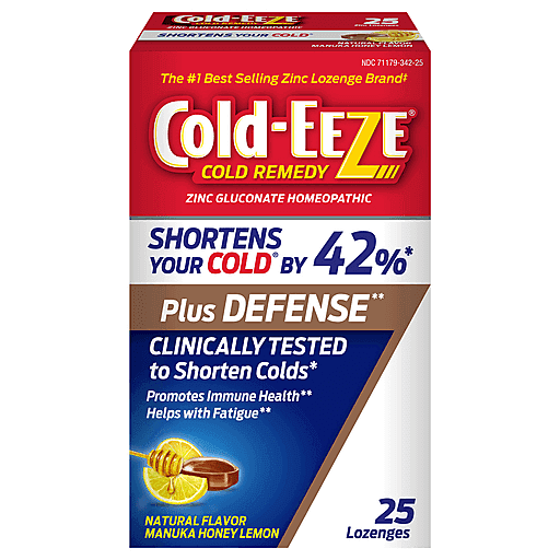 Cold-EEZE is the original and #1 best-selling zinc lozenge brand, helps shorten the duration of your cold by 42% when taken at the first sign of symptoms and used as directed. Our proprietary zinc gluconate formula contains 13.3 mg of zinc per cough drop which reduces the severity of cold symptoms including cough, sore throat, nasal congestion, post nasal drip, and/or hoarseness. Our Plus Defense lozenges and chewable gels contain sambucus nigra, rose hips, and echinacea to help promote immune health. Our zinc cold remedy lozenge a manuka honey lemon flavor is vegan, kosher, and free from artificial colors and preservatives. Our zinc lozenges are gluten-free, soy-free, dairy-free, peanut-free, drug-free, and non-drowsy. Also try our Zinc Plus Cold + Flu products that can shorten colds and deliver additional benefits to relieve cold and flu symptoms including cough, nasal congestion, irritated respiratory tract, and throat irritation. Active ingredient is in the official Homeopathic Pharmacopoeia of the United States. Claims based on traditional homeopathic practice, not accepted medical evidence. These statements have not been evaluated by the FDA. This product is not intended to diagnose, treat, cure or prevent any disease. *Based on unit sales of cold shortening homeopathic zinc lozenges.