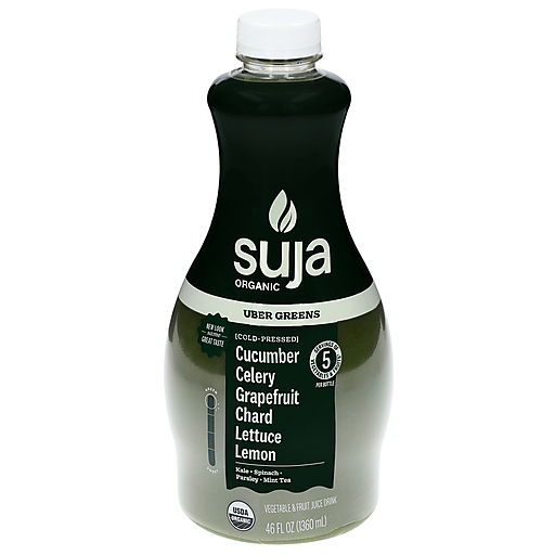 Suja Organic Uber Greens is a nutrient-dense cold pressed juice drink featuring bold, earthy greens with a light citrus tang. This Suja green juice is a delicious way to drink your vegetables and gulp your greens. This organic green juice has 5 servings of fruits and vegetables per 46 fl oz bottle and contains no added sugar. This green juice is an excellent source of potassium, vitamin C and vitamin K. Leafy greens like kale, spinach and lettuce are balanced with grapefruit, lemon and refreshing mint tea to give this organic juice an earthy, bold tang and optimal taste. Make every sip count with Suja Organic Uber Greens to give your body a nutrient boost with breakfast, at school, while traveling or post-workout. Suja Organic juice is vegan, gluten free and non-GMO. Getting your greens feels good. And with Suja, you're getting your greens.